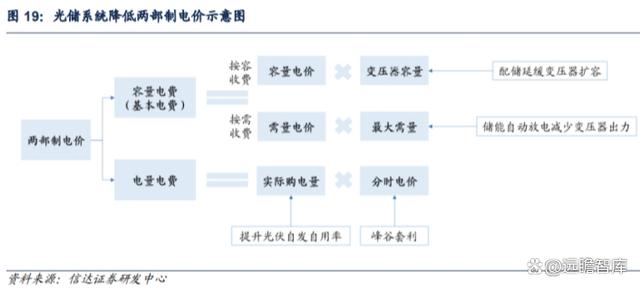 4)擴(kuò)大兩部制電價工商業(yè)范圍,增加需量管理需求。第三輪輸配電價改革擴(kuò)大了兩部制電價執(zhí)行范圍,對于用電容量在 100-315kVA 的工商業(yè)用戶,可選擇執(zhí)行兩部制電價;用電容量在 315kVA 及以上的工商業(yè)用戶,執(zhí)行兩部制電價,現(xiàn)執(zhí)行單一制電價的用戶可選擇執(zhí)行單一制電價或兩部制電價。容量電費(基本電費)按用戶變壓器容量(按容收費)或運行的最大需要量(按需收費)計算,電量電費按用戶實際購電量計算。工商業(yè)用戶因此增加精細(xì)化管理電費的需求,比如安裝光儲系統(tǒng)可以同時降低容量電費與電量電費,節(jié)省用電支出。精細(xì)化管理需要布局能量管理系統(tǒng),也為虛擬電廠的建設(shè)奠定基礎(chǔ)。