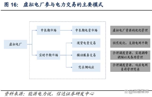 工商業(yè)儲能是虛擬電廠的重要一環(huán),虛擬電廠或提升工商業(yè)儲能的收益、改變工商業(yè)的資產(chǎn)屬性。虛擬電廠的基礎(chǔ)為靈活性資源,核心是智能化平臺。同時虛擬電廠是較為有經(jīng)濟(jì)性的“削峰”投資,政策持續(xù)加速推進(jìn)虛擬電廠建設(shè)。根據(jù)國家電網(wǎng)測算,通過火電廠實現(xiàn)電力系統(tǒng)削峰填谷,滿足 5%的峰值負(fù)荷需要投資 4000 億;而通過虛擬電廠,在建設(shè)、運營、激勵等環(huán)節(jié)投資僅需 500-600 億元。