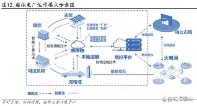 未來隨著電力市場成熟,工商業(yè)儲能也可以通過虛擬電廠以聚合的方式參與電力市場交易。虛擬電廠是應用先進的通訊和控制技術,實現(xiàn)對大量散布的分布式資源的聚合調控,使這些分布式資源規(guī)模化,并具備參與電力系統(tǒng)運行調度的資格和能力。“虛擬”的含義是這些資源并非真正的發(fā)電廠,而是對分布式資源的聚合,“電廠”的含義是能夠像真正的發(fā)電廠一樣為電力系統(tǒng)提供電能量和輔助服務。