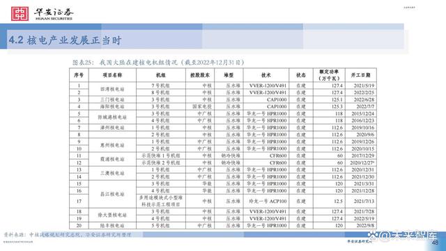 2016~2020年,美國(guó)西屋的AP1000和法國(guó)電力集團(tuán)的 EPR三代核電技術(shù)全球首堆先后在我國(guó)成功建成投產(chǎn)。 我國(guó)在過去近40年中,成為全球唯一一個(gè)從沒有中斷核 電項(xiàng)目建設(shè)的國(guó)家,且掌握了建造世界主流核電機(jī)型的 能力,施工能力卓越,對(duì)于核電項(xiàng)目的建設(shè)有先進(jìn)管理 理念和豐富的經(jīng)驗(yàn),對(duì)核電工期具備強(qiáng)有力的掌控能力。