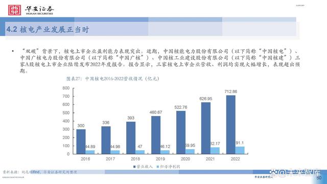 據(jù)中國(guó)核能行業(yè)協(xié)會(huì)發(fā)布的2022年能源產(chǎn)品產(chǎn)量統(tǒng)計(jì)數(shù) 據(jù)顯示,中國(guó)核能發(fā)電量?jī)H占總發(fā)電量的4.98% ,低于 中亞和東亞平均值6.3%相比于北美的 18.8% ,北歐、西 歐和南歐的 24.2% ,東歐的 22.1% ,中國(guó)核電在低碳政 策背景下的發(fā)展?jié)摿Ψ浅4蟆?此外,無(wú)論是國(guó)內(nèi)大規(guī)模上馬核電項(xiàng)目還是核電走向國(guó) 際市場(chǎng),其經(jīng)濟(jì)效益十分顯著。在國(guó)內(nèi),核電項(xiàng)目被稱 為印鈔機(jī),在雙碳減排的驅(qū)動(dòng)下,以前還受到電網(wǎng)調(diào)峰 要求的各核電站,近兩年來(lái)已經(jīng)是應(yīng)發(fā)盡發(fā),機(jī)組有效 利用小時(shí)數(shù)紛紛創(chuàng)出新高,電廠效益節(jié)節(jié)攀升。核電項(xiàng) 目投資也受到各地方政府和各大銀行的大力支持和追捧。 作為一個(gè)政策導(dǎo)向型顯著的行業(yè),近年來(lái)迎來(lái)了密集的 政策利好,可以預(yù)見我國(guó)核電行業(yè)將迎來(lái)一個(gè)高質(zhì)量發(fā) 展的黃金期。