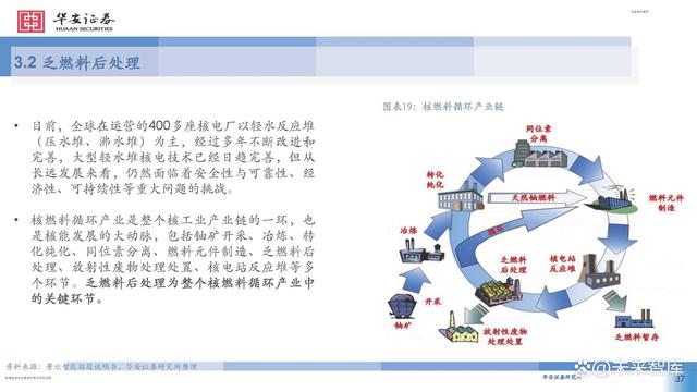 目前,全球在運(yùn)營(yíng)的400多座核電廠以輕水反應(yīng)堆 (壓水堆、沸水堆)為主,經(jīng)過多年不斷改進(jìn)和 完善,大型輕水堆核電技術(shù)已經(jīng)日趨完善,但從 長(zhǎng)遠(yuǎn)發(fā)展來(lái)看,仍然面臨著安全性與可靠性、經(jīng) 濟(jì)性、可持續(xù)性等重大問題的挑戰(zhàn)。 核燃料循環(huán)產(chǎn)業(yè)是整個(gè)核工業(yè)產(chǎn)業(yè)鏈的一環(huán),也 是核能發(fā)展的大動(dòng)脈,包括鈾礦開采、冶煉、轉(zhuǎn) 化純化、同位素分離、燃料元件制造、乏燃料后 處理、放射性廢物處理處置、核電站反應(yīng)堆等多 個(gè)環(huán)節(jié)。乏燃料后處理為整個(gè)核燃料循環(huán)產(chǎn)業(yè)中 的關(guān)鍵環(huán)節(jié)。