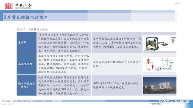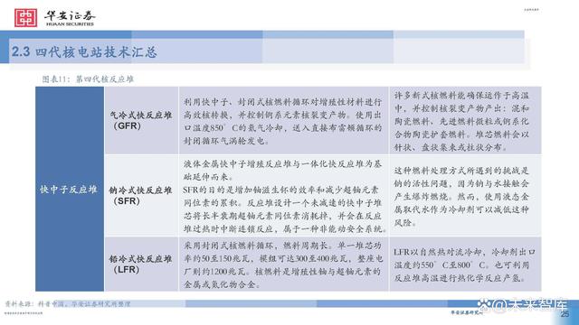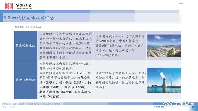 目前世界主流核電站皆采用第二代或第三代核電技術(shù)。其中,第二代和第三代的 主要核電堆型包括壓力堆和沸水堆等,在安全性和經(jīng)濟(jì)性上較前一代都有提升。第四代核電技術(shù)以在安全 性、經(jīng)濟(jì)性、核廢物處理、防止核擴(kuò)散上更為出色,代表堆型包括鈉冷快堆、鉛冷快堆、氣冷快堆、超高 溫氣冷堆等,目前主要研發(fā)試驗(yàn)階段,商業(yè)化預(yù)計(jì)在2030年左右實(shí)現(xiàn)。