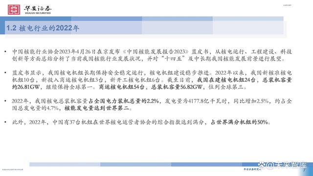 中國(guó)核能行業(yè)協(xié)會(huì)2023年4月26日在京發(fā)布《中國(guó)核能發(fā)展報(bào)告2023》藍(lán)皮書,從核電運(yùn)行、工程建設(shè)、科技 創(chuàng)新等方面總結(jié)分析了當(dāng)前我國(guó)核能行業(yè)發(fā)展?fàn)顩r,并對(duì)“十四五”及中長(zhǎng)期我國(guó)核能發(fā)展前景進(jìn)行展望。藍(lán)皮書顯示,我國(guó)核電機(jī)組長(zhǎng)期保持安全穩(wěn)定運(yùn)行,核電機(jī)組建設(shè)穩(wěn)步推進(jìn)。2022年以來(lái),我國(guó)新核準(zhǔn)核電 機(jī)組10臺(tái),新投入商運(yùn)核電機(jī)組3臺(tái),新開工核電機(jī)組6臺(tái)。截至目前,我國(guó)在建核電機(jī)組24臺(tái),總裝機(jī)容量 約26.81GW,繼續(xù)保持全球第一。商運(yùn)核電機(jī)組54臺(tái),總裝機(jī)容量56.82GW,位列全球第三。 2022年,我國(guó)核電總裝機(jī)容量占全國(guó)電力裝機(jī)總量的2.2%,發(fā)電量為4177.8億千瓦時(shí),同比增加2.5%,約占全國(guó)總發(fā)電量的4.7%,核能發(fā)電量達(dá)到世界第二。 此外,2022年,中國(guó)有37臺(tái)機(jī)組在世界核電運(yùn)營(yíng)者協(xié)會(huì)的綜合指數(shù)達(dá)到滿分,占世界滿分機(jī)組的50%。