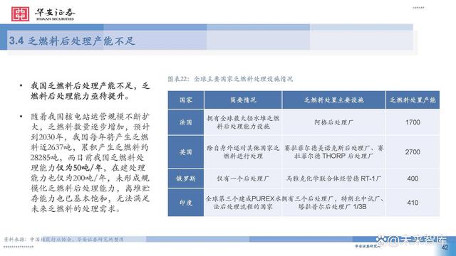 2007年,我國(guó)確定了符合國(guó)情的閉式燃料循環(huán)路線。乏燃料后處理屬于高精尖技術(shù),處理廠建設(shè)需耗時(shí)10 年。目前,法國(guó)、日本、印度等國(guó)乏燃料后處理產(chǎn)能已可覆蓋最新年產(chǎn)生量,而我國(guó)僅有中核四0四有限 公司于2010年投產(chǎn)的中試廠產(chǎn)能為50tHM/年。 隨著壓水堆裝機(jī)容量快速增長(zhǎng),我國(guó)乏燃料的總量也將迅速增長(zhǎng)。當(dāng)前,我國(guó)乏燃料后處理基礎(chǔ)研究與俄 羅斯、美國(guó)、法國(guó)等國(guó)仍存差距,后處理關(guān)鍵設(shè)備如剪切機(jī)、溶解器等仍有待進(jìn)一步研發(fā),尚未建成商用 后處理廠且不具備相應(yīng)的運(yùn)行經(jīng)驗(yàn)。