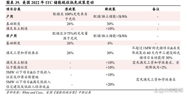 儲能稅收減免提升至以 30%為基礎(chǔ),經(jīng)濟性進一步提升。 此前的 ITC 政策稅收抵免的基礎(chǔ)額度為 26%,現(xiàn)在在滿足工資和學(xué)徒要求后,基礎(chǔ)抵免可以達到 30%,另外,如果同時能夠滿足其他條件, 例如本土制作、位于能源社區(qū)等可進一步提升抵免的額度,儲能電站的經(jīng)濟性得到進一步提升。