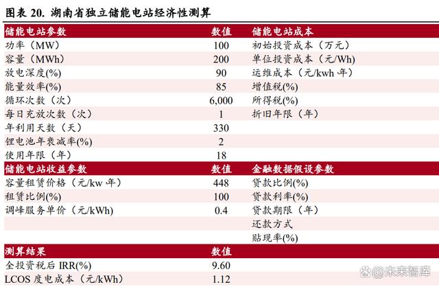 獨立儲能電站經(jīng)濟性可觀。我們以湖南省的實際情況為例,來測算獨立儲能電站的經(jīng)濟性,在目前 的各種條件下,湖南省獨立儲能電站的全投資稅后 IRR 達到 9.60%,具有客觀的收益性。 1)容量租賃收入假設(shè):參考湖南省的城步儒林 100MW/200MWh 儲能電站項目已經(jīng)簽訂的容量租賃 合同,湖南省的容量租賃價格為 448 元/kw*年。2)電力輔助服務(wù)收入假設(shè):電力輔助服務(wù)包括為電網(wǎng)公司提供調(diào)峰、調(diào)頻等服務(wù),按照每次調(diào)用規(guī) 模及調(diào)用次數(shù),電網(wǎng)公司給儲能電站支付費用。 參考湖南省的現(xiàn)行 政 策以及城步儒林 100MW/200MWh 儲能電站項目的運行情況,假設(shè)一年調(diào)用 330 天,每天一次充放,調(diào)用費用為每 次 400 元/MWh。