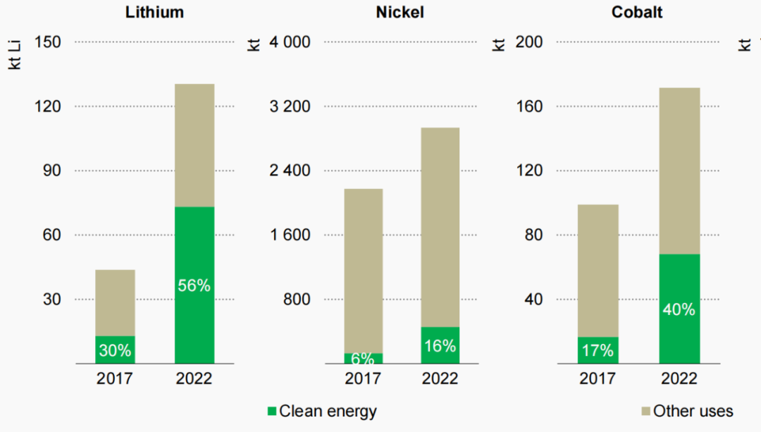 圖4 清潔能源應用占鋰、鎳、鈷需求比重 (來源:IEA)