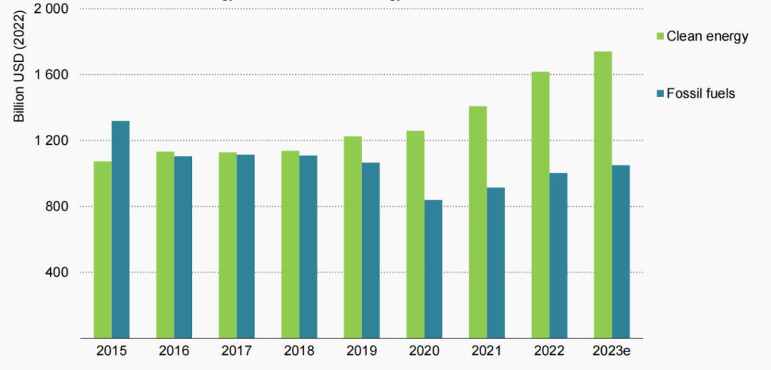 圖1 2015—2023年全球對清潔能源和化石燃料的投資情況 (來源:IEA)