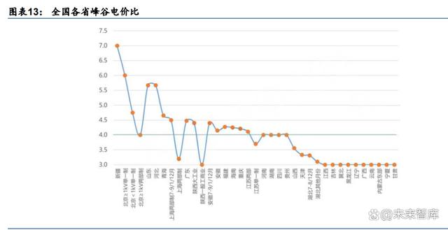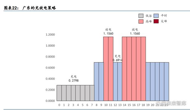 國家發(fā)改委推動合理拉大峰谷電價差,引導(dǎo)電力用戶削峰填谷。2021 年 7 月,國家發(fā)改委 印發(fā)《關(guān)于進(jìn)一步完善分時電價機(jī)制的通知》,部署各地進(jìn)一步完善分時電價機(jī)制,合理拉 大峰谷電價價差,為引導(dǎo)電力用戶削峰填谷、促進(jìn)儲能加快發(fā)展釋放了清晰強(qiáng)烈的價格信 號:(1)優(yōu)化峰谷電價機(jī)制:積極優(yōu)化峰谷電價機(jī)制,科學(xué)劃分峰谷時段,合理確定峰谷 電價價差,系統(tǒng)峰谷差率超過 40%的地方,峰谷電價價差原則上不低于 4:1;其他地方原 則上不低于 3:1。(2)建立尖峰電價機(jī)制:在峰谷電價的基礎(chǔ)上推行尖峰電價機(jī)制,主要基 于系統(tǒng)最高負(fù)荷情況合理確定尖峰時段,尖峰電價在峰段電價基礎(chǔ)上上浮比例原則上不低 于 20%??蓞⒄占夥咫妰r機(jī)制建立深谷電價機(jī)制。隨后,各省市分時電價政策步入快速完 善期,出臺相關(guān)政策調(diào)整峰谷時段劃分和電價浮動比例。