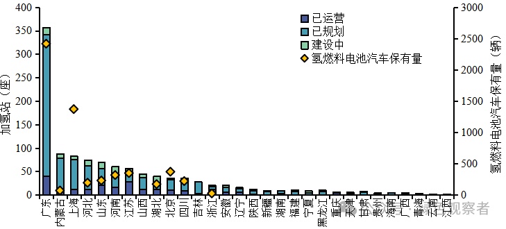 圖2 全國(guó)加氫站及氫燃料電池汽車保有量分布資料來(lái)源:根據(jù)氫能產(chǎn)業(yè)大數(shù)據(jù)平臺(tái)檢索所得(檢索時(shí)間2023年9月14)。注:部分省市尚無(wú)氫燃料電池汽車,故數(shù)據(jù)為零。