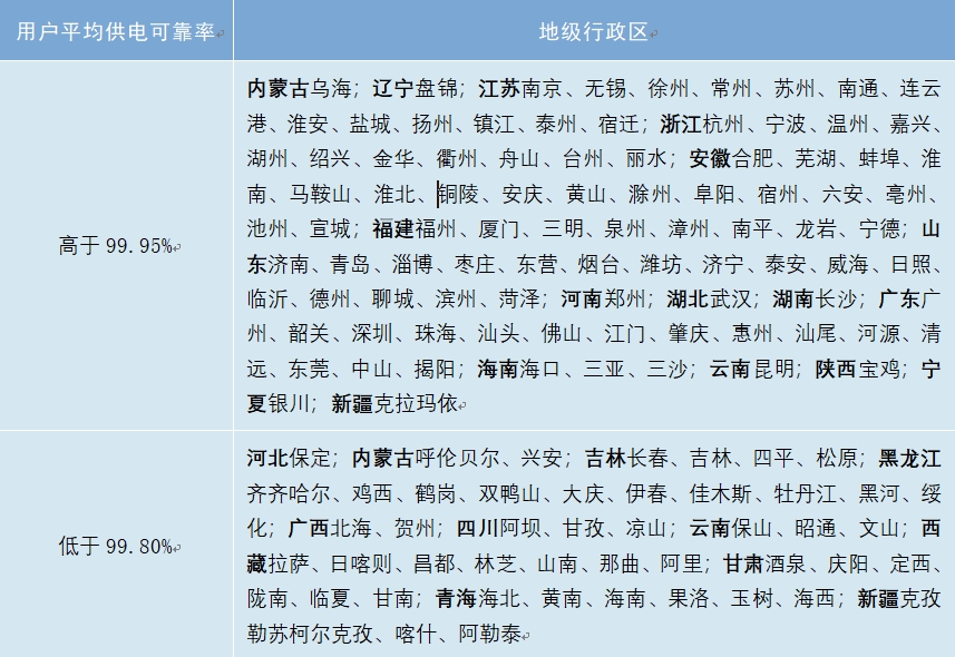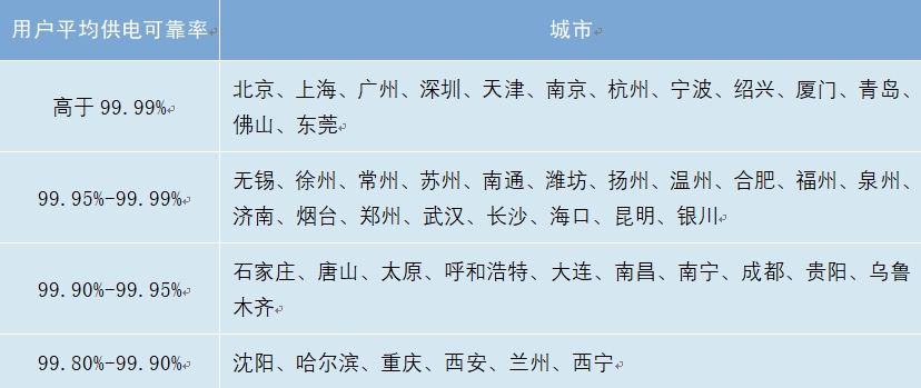 2023年,全國50個主要城市供電可靠性繼續(xù)保持較高水平,其中,北京、上海、廣州、深圳、天津、南京、杭州、寧波、紹興、廈門、青島、佛山、東莞用戶平均供電可靠率高于99.99%;長春、拉薩用戶平均供電可靠率低于99.90%。