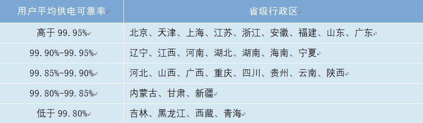 2023年,全國31個省級行政區(qū)中,北京、上海、廣東、天津、江蘇、浙江、安徽、福建、山東的用戶平均供電可靠率高于99.95%,內蒙古、吉林、黑龍江、西藏、甘肅、青海、新疆的用戶平均供電可靠率低于99.85%。