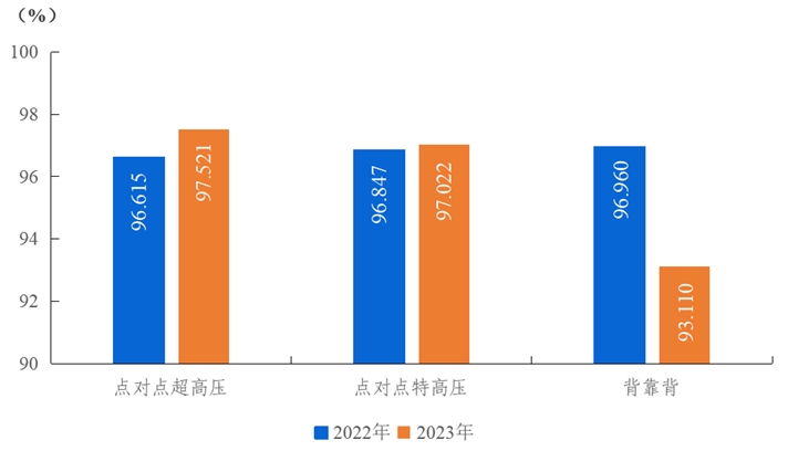 2023年,納入電力可靠性統(tǒng)計的點對點超高壓直流輸電系統(tǒng)能量可用率為97.521%,同比上升0.906個百分點;點對點特高壓直流輸電系統(tǒng)能量可用率為97.022%,同比上升0.175個百分點;背靠背直流輸電系統(tǒng)能量可用率為93.110%,同比下降3.850個百分點。