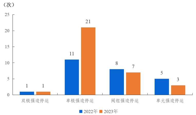 2023年,納入電力可靠性統(tǒng)計的直流輸電系統(tǒng)發(fā)生32次強迫停運,其中雙極強迫停運1次,與上一年持平;單極強迫停運21次,同比增加10次;閥組強迫停運7次,同比減少1次;單元強迫停運3次,同比減少2次。各系統(tǒng)強迫停運的等效停運小時累計值為383.35小時。