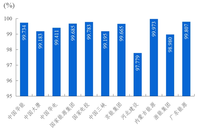 2023年,發(fā)電側11家集團公司變壓器可用系數前三位分別是廣東省能源集團有限公司99.747%、內蒙古能源集團有限公司99.576%、國家能源投資集團有限責任公司99.097%。