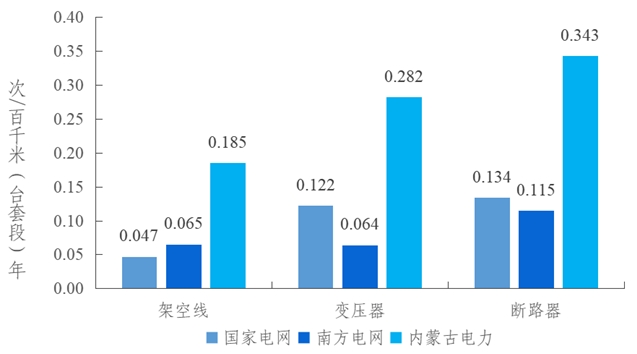 2023年,電網側3家集團公司國家電網、南方電網、內蒙古電力的架空線路強迫停運率分別是0.047次/百千米年、0.065次/百千米年和0.185次/百千米年,變壓器強迫停運率分別是0.122次/百臺年、0.064次/百臺年和0.282次/百臺年,斷路器強迫停運率分別是0.134次/百臺年、0.115次/百臺年和0.343次/百臺年。