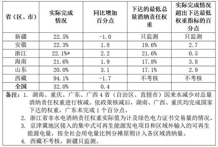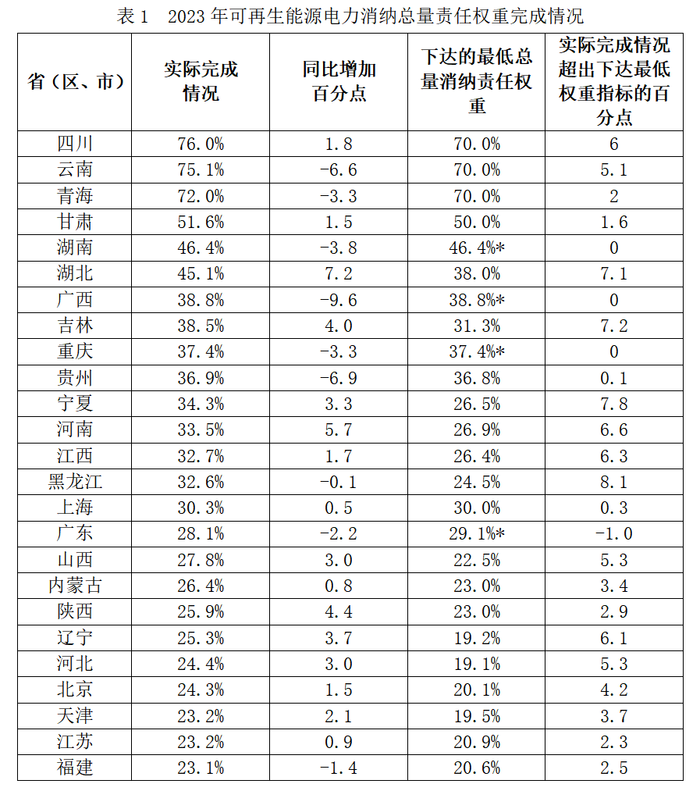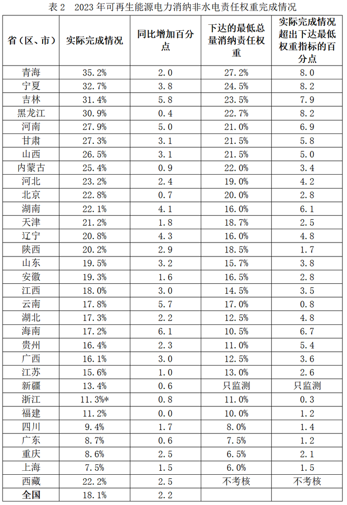 根據(jù)《國家發(fā)展改革委辦公廳 國家能源局綜合司關(guān)于2023年可再生能源電力消納責(zé)任權(quán)重及有關(guān)事項的通知》(發(fā)改辦能源〔2023〕569號),綜合考慮各省本地生產(chǎn)、本地利用以及外來電力消納情況,全國各省(自治區(qū)、直轄市)可再生能源電力消納責(zé)任權(quán)重總體完成較好,具體完成情況如下。