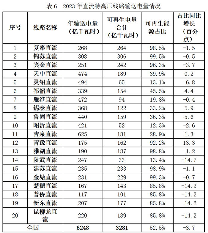 2023年,20條直流特高壓線路年輸送電量6248億千瓦時,其中可再生能源電量3281億千瓦時,同比提高3.6%,可再生能源電量占全部直流特高壓線路總輸送電量的52.5%。國家電網(wǎng)運(yùn)營的16條直流特高壓線路總輸送電量5537億千瓦時,其中可再生能源電量2672億千瓦時,占總輸送電量的48.3%;南方電網(wǎng)運(yùn)營的4條直流特高壓線路輸送電量711億千瓦時,其中可再生能源電量610億千瓦時,占總輸送電量的85.8%。