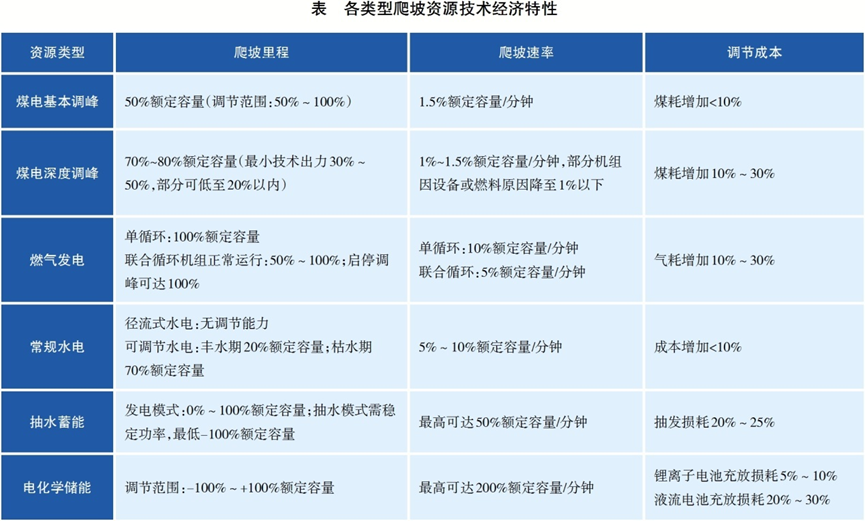 系統(tǒng)爬坡能力需基于各類型爬坡資源技術(shù)經(jīng)濟特性開展分析。從爬坡速率和里程等調(diào)節(jié)性能看,電化學儲能和抽水蓄能普遍優(yōu)于煤電、氣電等火電電源,可調(diào)節(jié)水電枯水期的調(diào)節(jié)能力優(yōu)于豐水期;從調(diào)節(jié)成本看,煤電基本調(diào)峰和常規(guī)水電調(diào)節(jié)成本較低,氣電調(diào)峰次之,抽水蓄能與電化學儲能的成本取決于抽發(fā)電價差與轉(zhuǎn)換效率,煤電深度調(diào)峰成本較高。