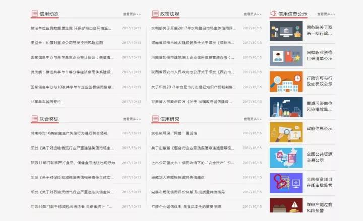 打開(kāi)新版“信用中國(guó)”網(wǎng)站,《中國(guó)信用》雜志記者發(fā)現(xiàn)查詢類欄目、資訊類欄目、公示類欄目分區(qū)設(shè)置,更加突出權(quán)威性、及時(shí)性、互動(dòng)性和可讀性。查詢類欄目包括統(tǒng)一社會(huì)信用代碼查詢、行政許可和行政處罰信息查詢、守信紅名單查詢、失信黑名單查詢、重點(diǎn)關(guān)注名單查詢等。資訊類欄目新設(shè)標(biāo)準(zhǔn)規(guī)范、信用公示、聯(lián)合獎(jiǎng)懲、專項(xiàng)治理、誠(chéng)信文化、城市信用、信用刊物、個(gè)人信用、風(fēng)險(xiǎn)提示、信用大數(shù)據(jù)分析等。公示類欄目包括國(guó)家職業(yè)資格目錄清單、重點(diǎn)污染單位污染排放監(jiān)測(cè)信息、全國(guó)公共資源交易信息等十余個(gè)公示專區(qū)。欄目?jī)?nèi)容和信息將即時(shí)更新。